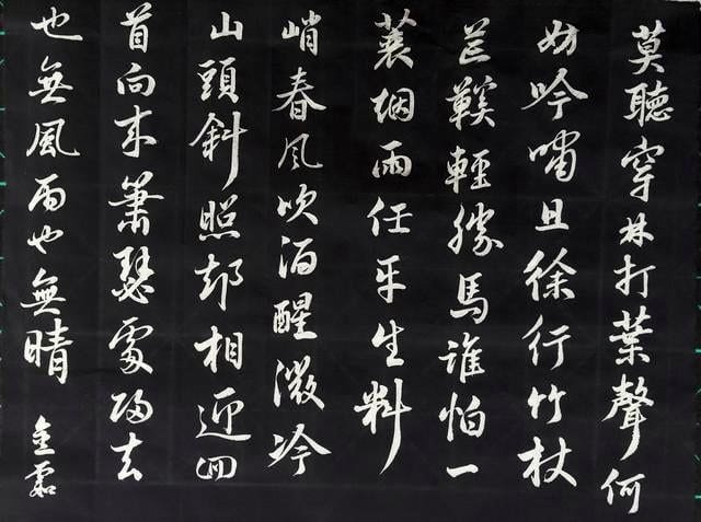 莫聽穿林打葉聲,何妨吟嘯且徐行。竹杖芒鞋輕勝馬,誰怕?一蓑煙雨任平生。
