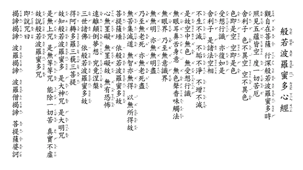 梵語原文आर्यावलोकितेश्वरो बोधिसत्त्वो गंभीरायां प्रज्ञापारमितायां चर्यां चरमाणो व्यवलोकयति स्म । पंचस्कन्धाः । तांश्च स्वभावशून्यान्पश्यति स्म । इह शारिपुत्र रूपं शून्यता शून्यतैव रूपं रूपान्न पृथक्शून्यता शून्यताया न पृथग्रूपं यद्रूपं सा शून्यता या शून्यता तद्रूपं । एवमेव वेदनासंज्ञासंस्कारविज्ञानानि । इह शारिपुत्र सर्वधर्माः शून्यतालक्षणा अनुत्पन्ना अनिरुद्धा अमला न विमला नोना न परिपूर्णाः । तस्माच्छारिपुत्र शून्यतायां न रूपं न वेदना न संज्ञा न संस्कारा न विज्ञानानि । न चक्षुःश्रोत्रघ्राणजिह्वाकायमनांसी । न रूपशब्दगंधरसस्प्रष्टव्यधर्माः । न चक्षुर्धातुर्यावन्न मनोविज्ञानधातुः । न विद्या नाविद्या न विद्याक्षयो नाविद्याक्षयो यावन्न जरामरणं न जरामरणक्षयो न दुःखसमुदयनिरोधमार्गा न ज्ञानं न प्राप्तिः ॥ तस्मादप्राप्तित्वाद्बोधिसत्त्वाणां प्रज्ञापारमितामाश्रित्य विहरत्यचित्तावरणः । चित्तावरणनास्तित्वादत्रस्तो विपर्यासातिक्रान्तो निष्ठनिर्वाणः ।। त्र्यध्वव्यवस्थिताः सर्वबुद्धाः प्रज्ञापारमितामाश्रित्यानुत्तरां सम्यक्सम्बोधिमभिसंबुद्धाः ।। तस्माज्ज्ञातव्यं प्रज्ञापारमिता महामन्त्रो महाविद्यामन्त्रो ऽनुत्तरमन्त्रो ऽसमसममन्त्रः सर्वदुःखप्रशमनः । सत्यममिथ्यत्वात् । प्रज्ञपारमितायामुक्तो मन्त्रः । तद्यथा गते गते पारगते पारसंगते बोधि स्वाहा ।। इति प्रज्ञापारमिताहृदयं समाप्तम्